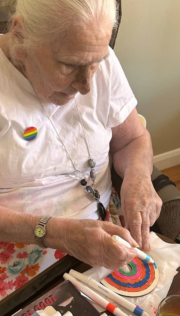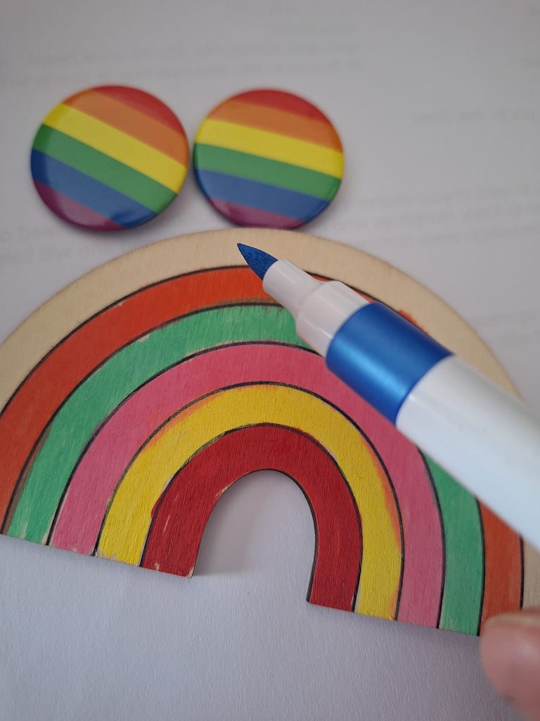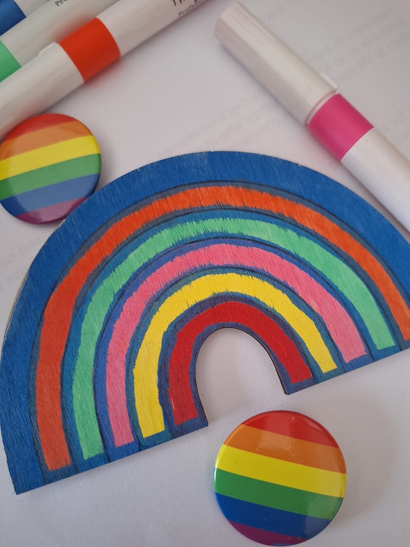 Pride week with our pin badges and rainbow crafts this week we bring awareness to our residents yesterday we started our week with rainbow wooden art.