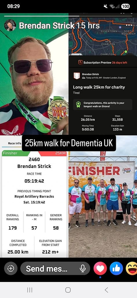 Brendan our Administrator’s son did the 25k walk for Dementia UK with his company raising more need funds to support this cause congratulations to him and his work colleagues…